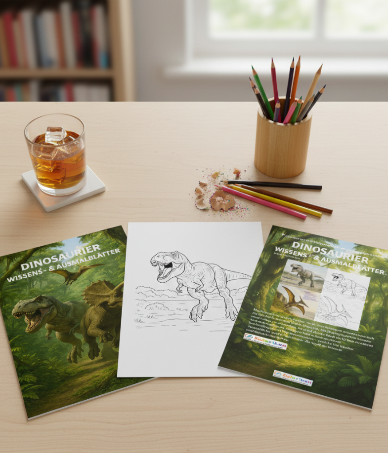 einer detailreichen Ausmalvorlage und einer kompakten Wissensseite mit wichtigen Fakten zu Größe, Lebensraum, Ernährung und Besonderheiten des jeweiligen Dinosauriers. Dadurch eignen sich die Blätter nicht nur für jüngere Kinder, sondern auch für neugierige Jugendliche und den Einsatz in Schule oder Homeschooling.