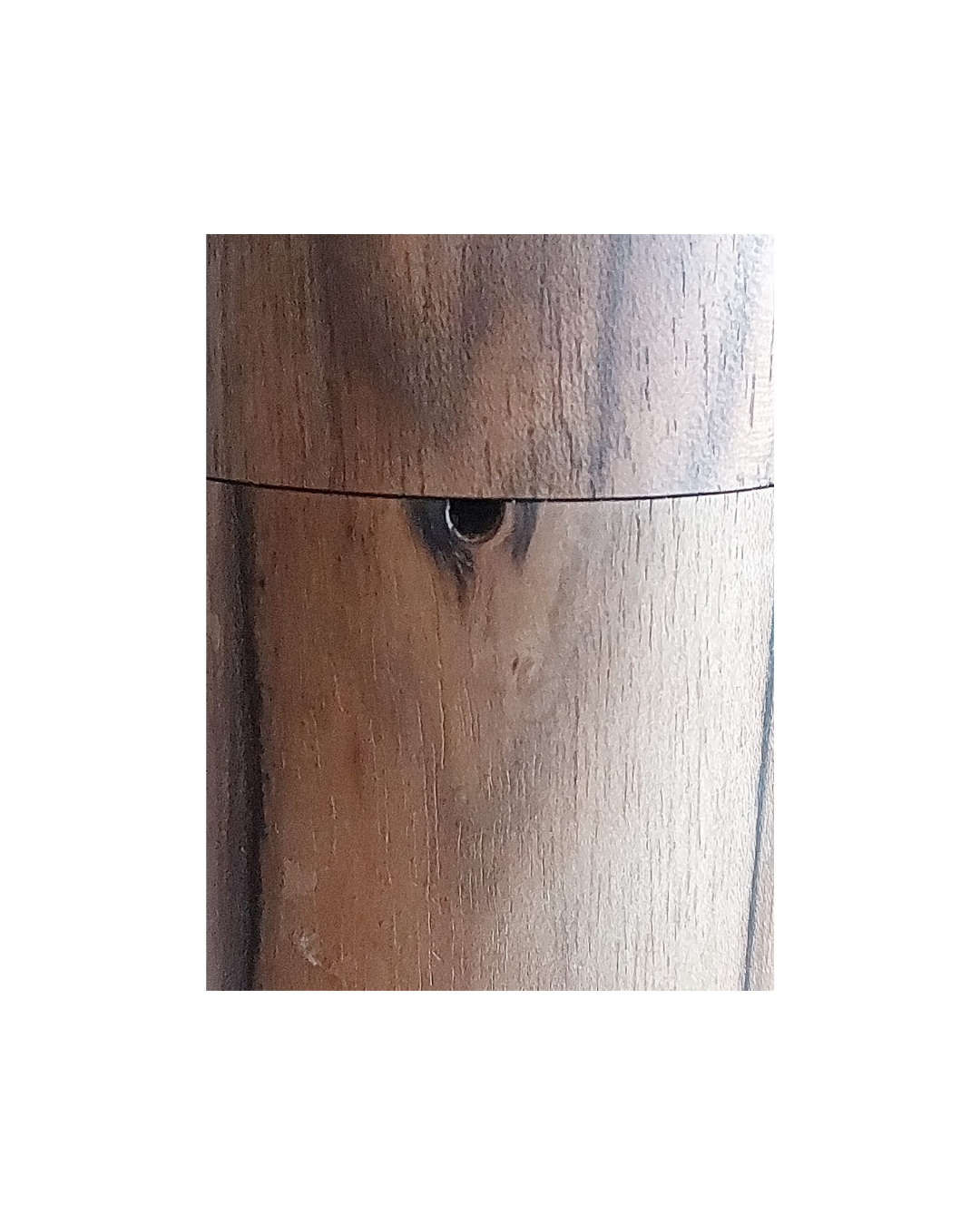 Bei diesem besonderen Stück befindet sich eine kleine natürliche Holzstelle (Astpunkt) im Bereich der Verbindung. Diese Stelle ist rein optisch und beeinträchtigt die Funktion der Mühle in keiner Weise. Gerade solche natürlichen Merkmale unterstreichen den individuellen Charakter von handgearbeitetem Holz.
