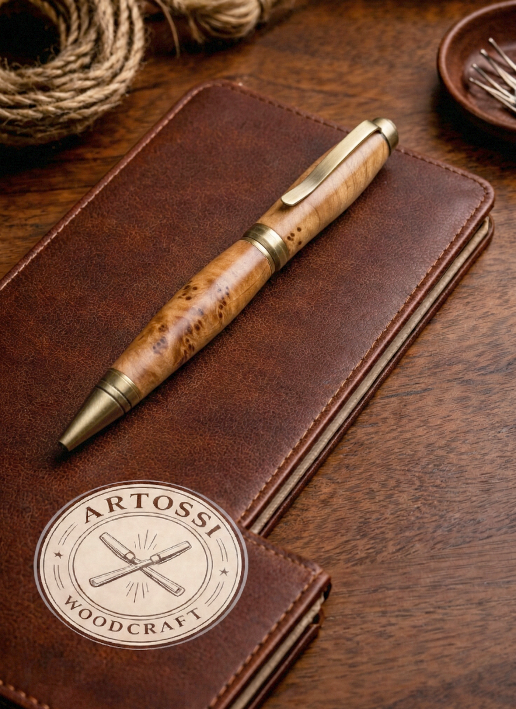 Die harmonische Verbindung aus sorgfältig gedrechseltem Holz und hochwertigen Metallkomponenten verleiht dem Schreibgerät eine zeitlose, elegante Ausstrahlung. Der Kugelschreiber liegt angenehm in der Hand und eignet sich sowohl als täglicher Begleiter als auch als besonderes Geschenk für Menschen, die echtes Handwerk zu schätzen wissen.
