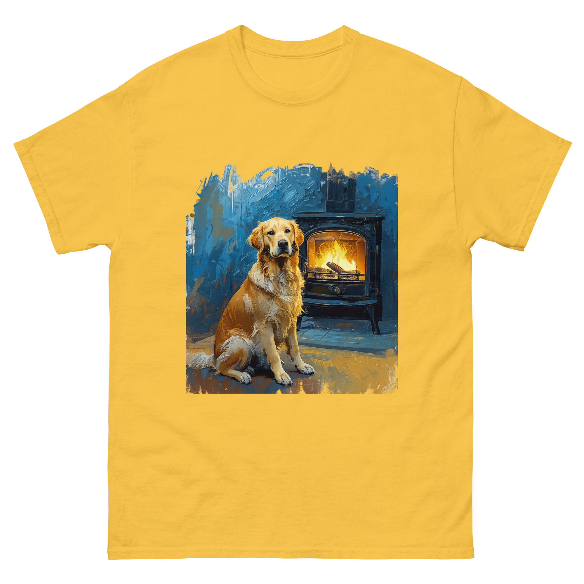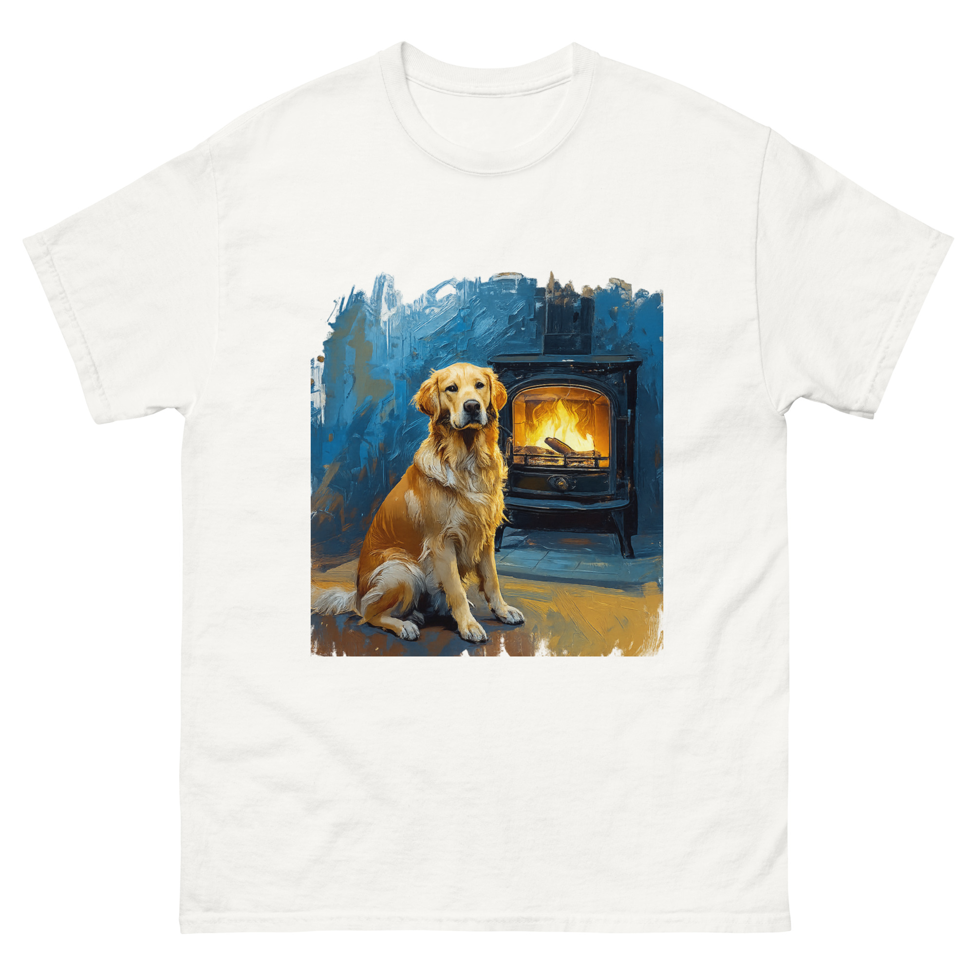 Dieses besondere T-Shirt zeigt einen Golden Retriever in einer ruhigen, warmen Szene vor einem brennenden Kamin – umgesetzt in einem ausdrucksstarken, gemäldeartigen Kunststil, inspiriert von klassischen Impressionisten.