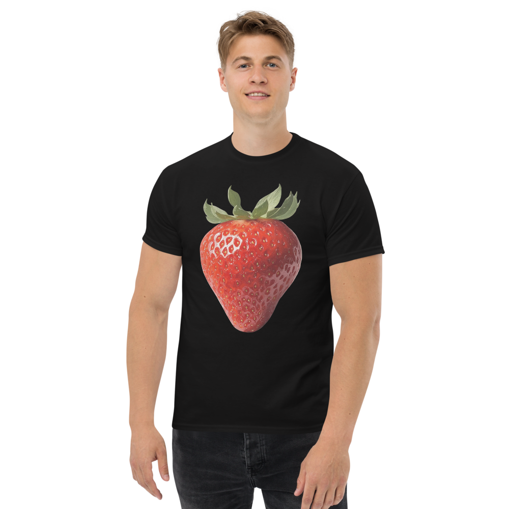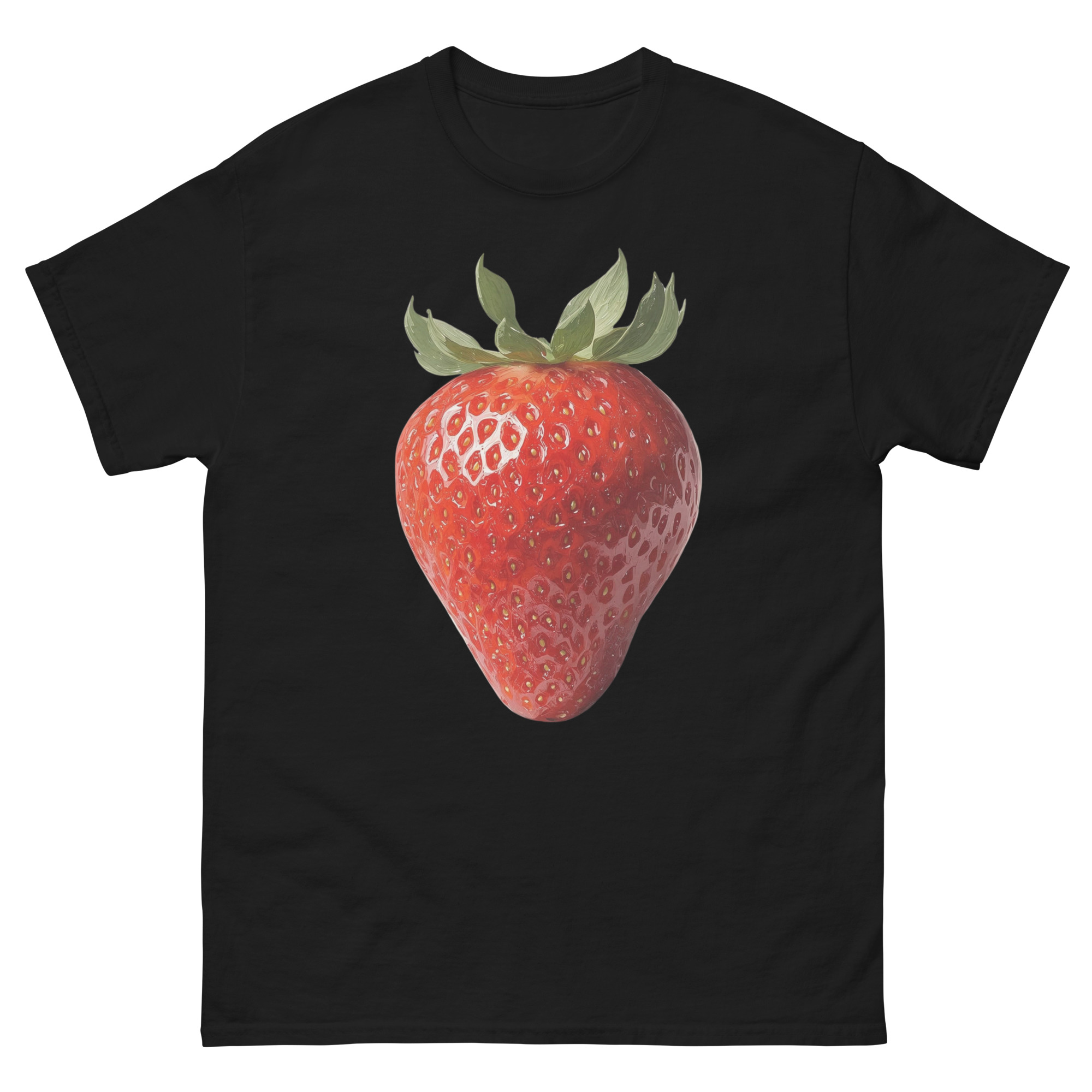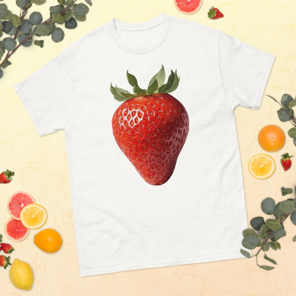 Dieses klassische Unisex T-Shirt zeigt eine detailreiche Erdbeere in einem künstlerischen Design im Ölmalstil – mit sichtbaren Pinselstrukturen und lebendiger Farbwirkung. Das Motiv wirkt ruhig, klar und wie ein kleines Kunstwerk auf Stoff.