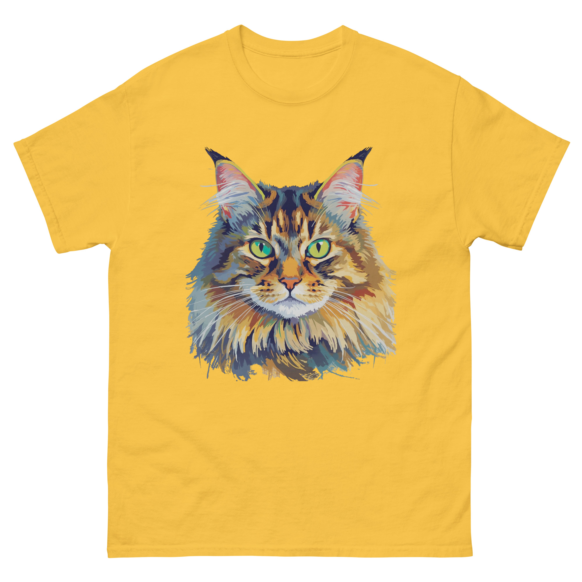 Maine-Coon Katzen T-Shirt – farbenfrohes Katzenporträt – Tierkunst Shirt für Katzenliebhaber – Unisex Baumwollshirt