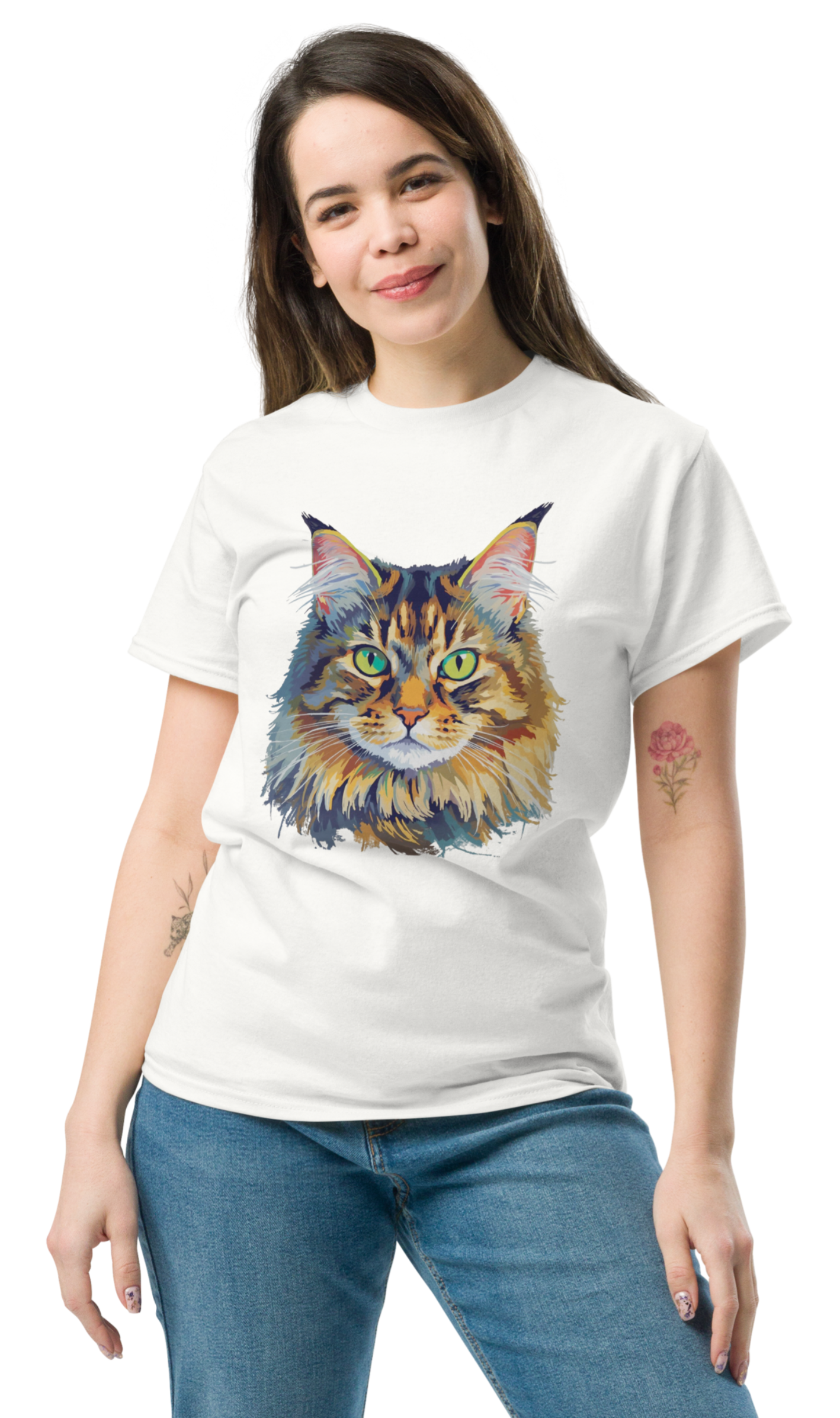 Das Motiv wurde bewusst groß und zentral gestaltet, damit die Katze auf dem Shirt sofort ins Auge fällt. Durch die lebendigen Farben entsteht ein moderner, kunstvoller Look, der Tierfreunde und Katzenliebhaber gleichermaßen begeistert.