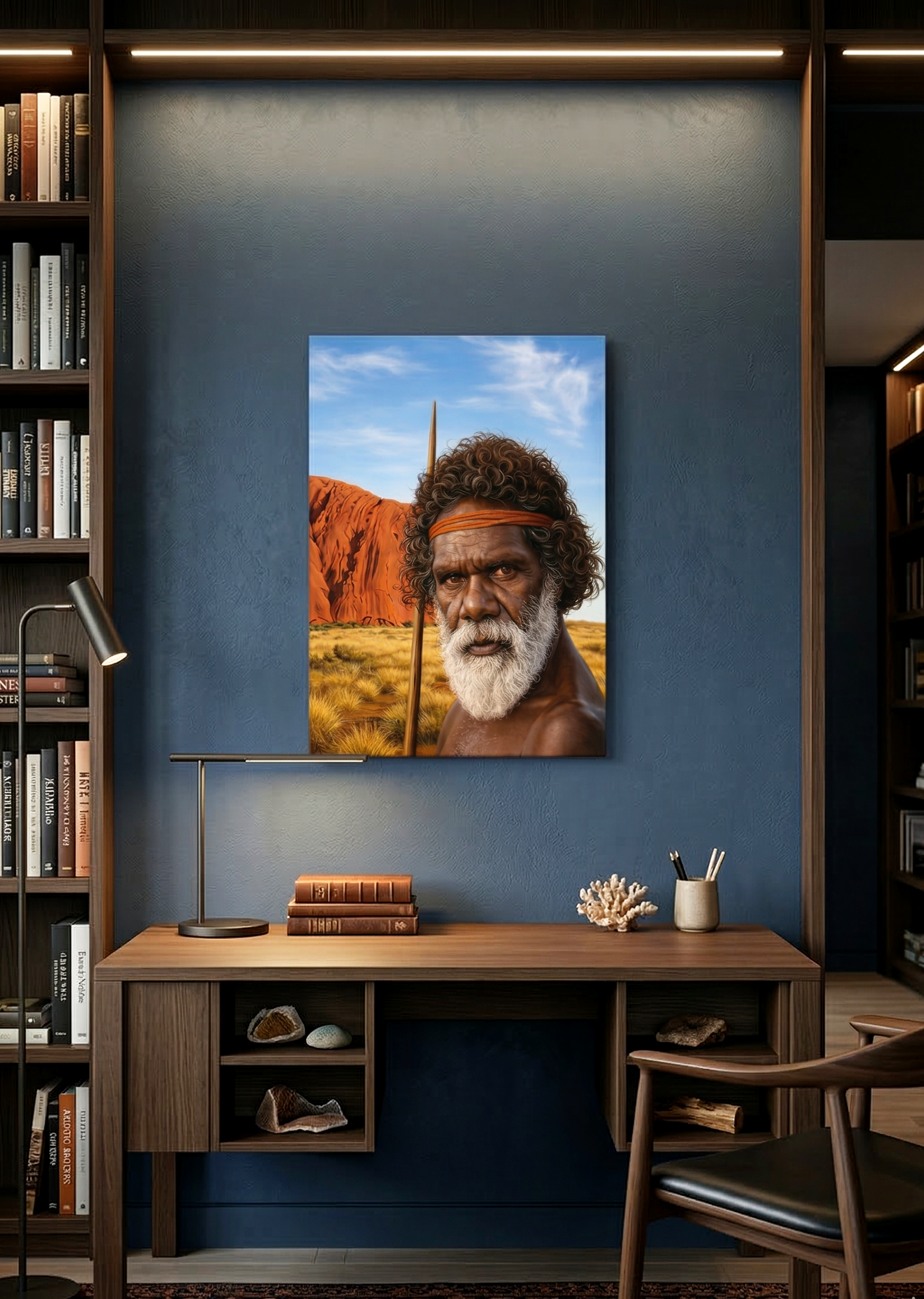 Spirit of the Outback – Porträt eines Aborigine-Ältesten vor roter Wüstenlandschaft | Leinwandbild Australien | Kunst aus dem australischen Outback