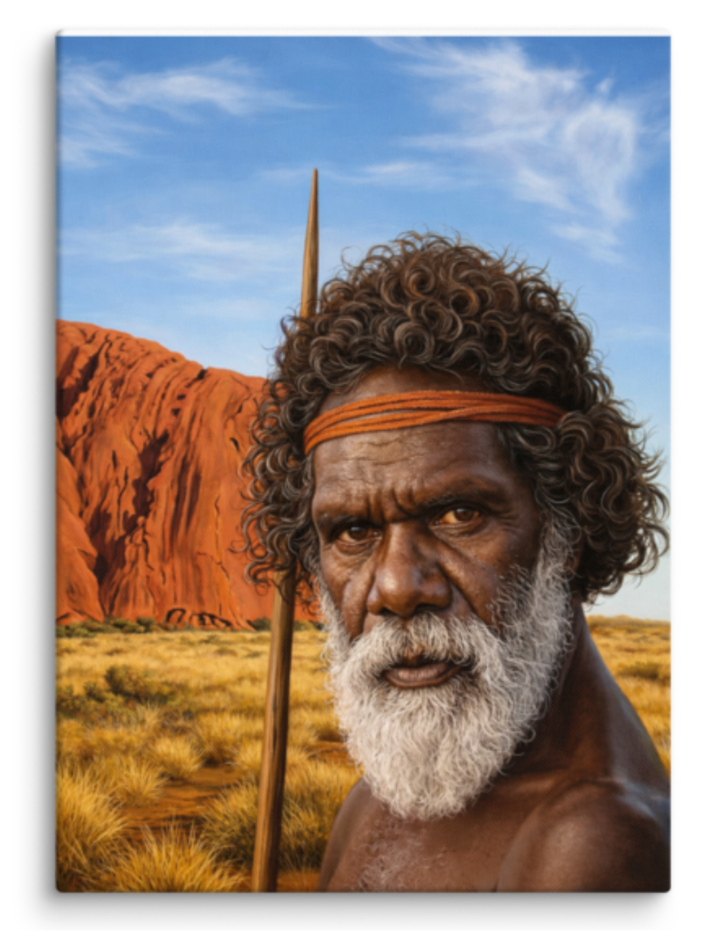 Im Mittelpunkt steht das Porträt eines Aborigine-Ältesten vor der weiten Landschaft Australiens. Der rote Felsen im Hintergrund, das goldene Gras der Steppe und der klare Himmel verleihen dem Motiv eine besondere Tiefe und Ruhe.