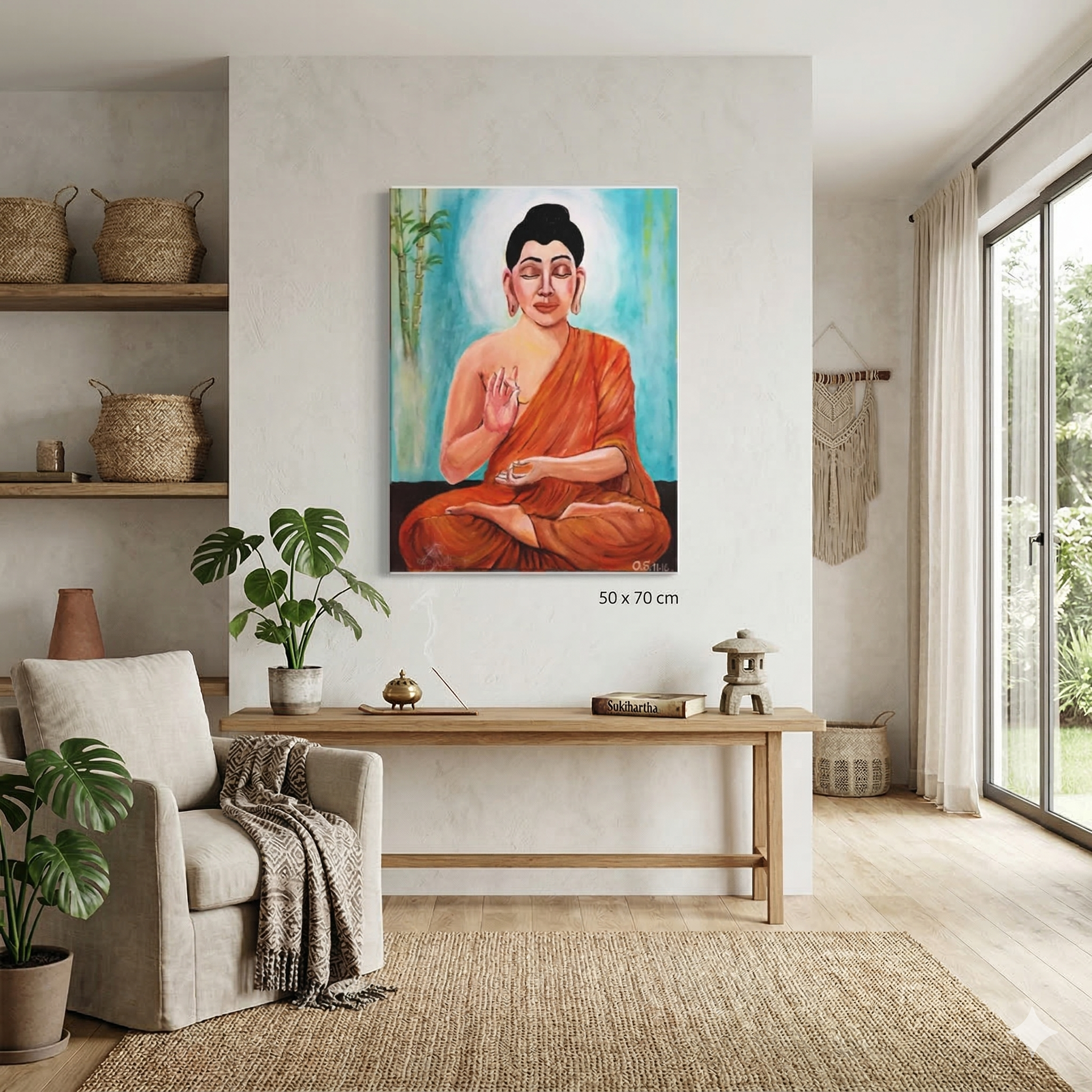 Das Bild strahlt Gelassenheit, Achtsamkeit und innere Ruhe aus und eignet sich besonders für Menschen, die eine entspannte und spirituelle Atmosphäre in ihrem Zuhause schaffen möchten.