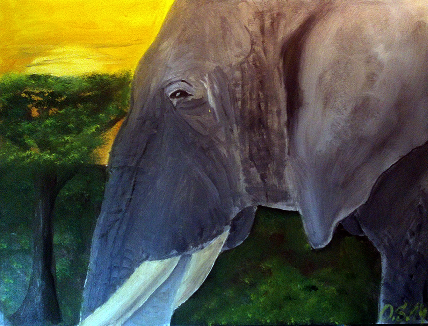 Handgemaltes Elefantenporträt in warmen, leuchtenden Farben.