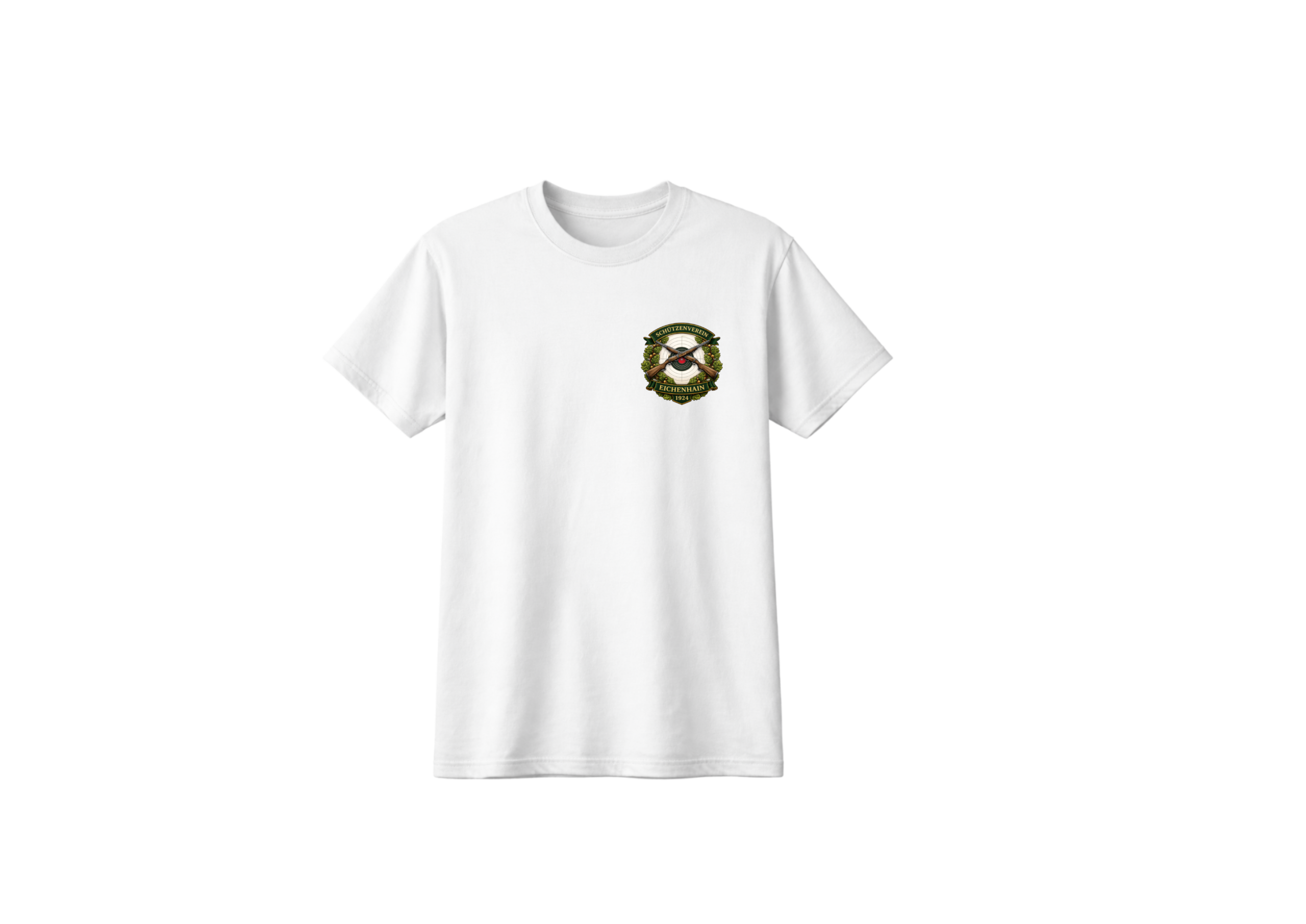 Dieses Shirt zeigt ein Beispiel für ein individuell gestaltetes Vereinswappen. Das Motiv „Schützenverein Eichenhain 1924“ ist ein fiktiver Verein und dient nur als Muster, wie ein persönliches Vereinslogo auf einem Shirt wirken kann.
