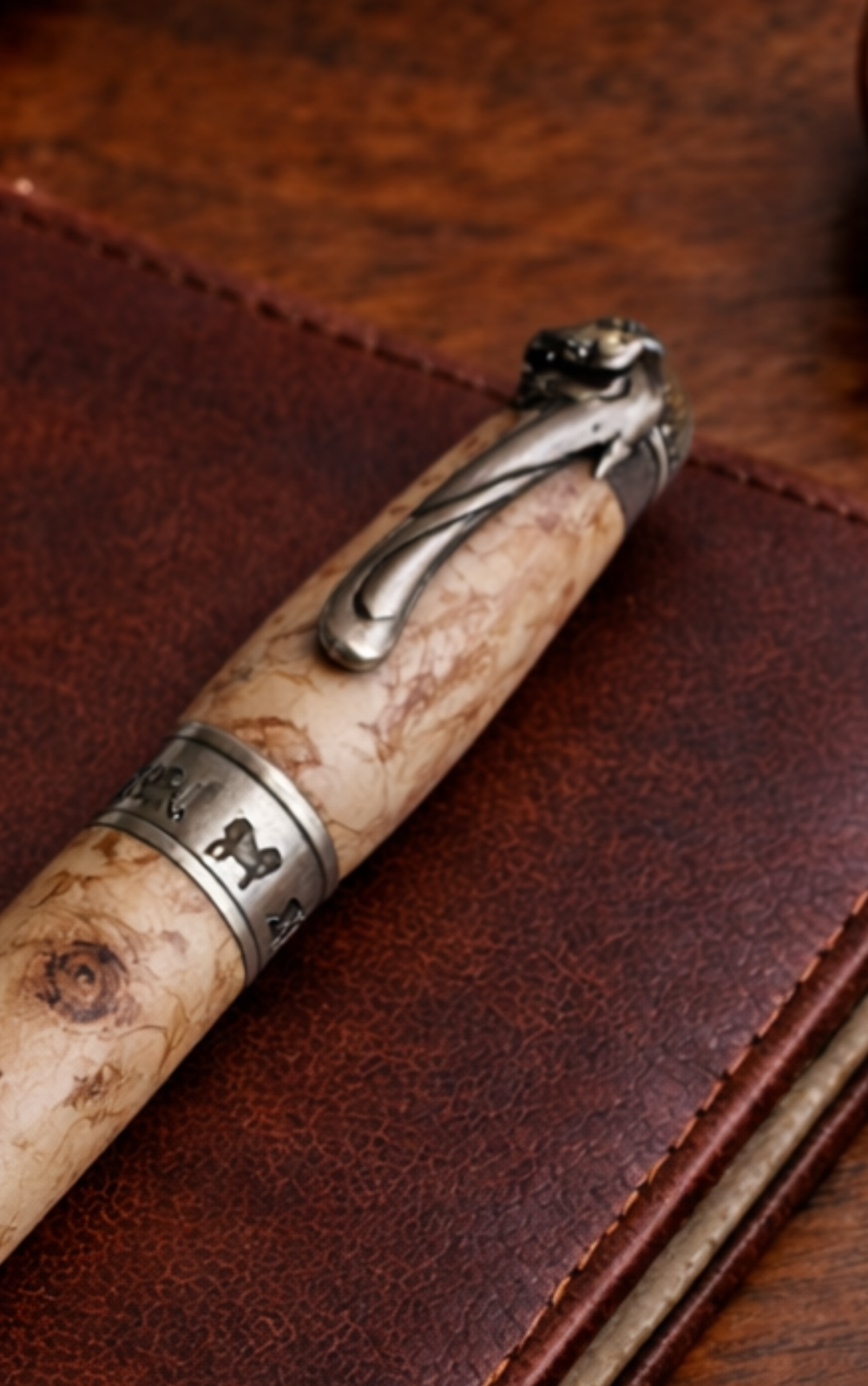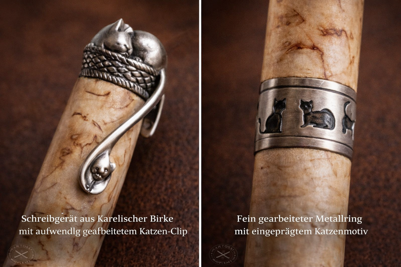 Holz und Schreibgeräte handmadeHandgefertigter Holz-Kugelschreiber aus Karelischer Birke mit Katzenmotiv – Besonderes Geschenk | ARTOSSI Woodcraft