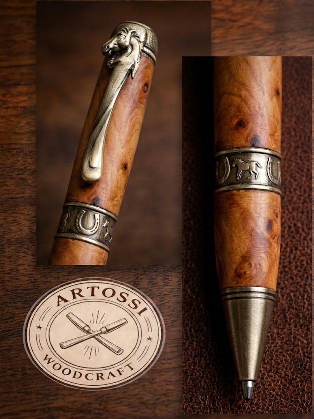 Holz und Schreibgeräte handmadeHandgefertigter Kugelschreiber aus gestockter Rosskastanie mit Pferdemotiv – Unikat | ARTOSSI Woodcraft