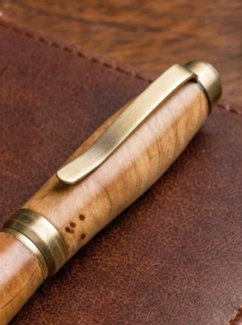 Holz und Schreibgeräte handmadeHandgefertigter Kugelschreiber aus heller gestockter Rosskastanie – Katzenmotiv – Unikat | Artossi Woodcraft